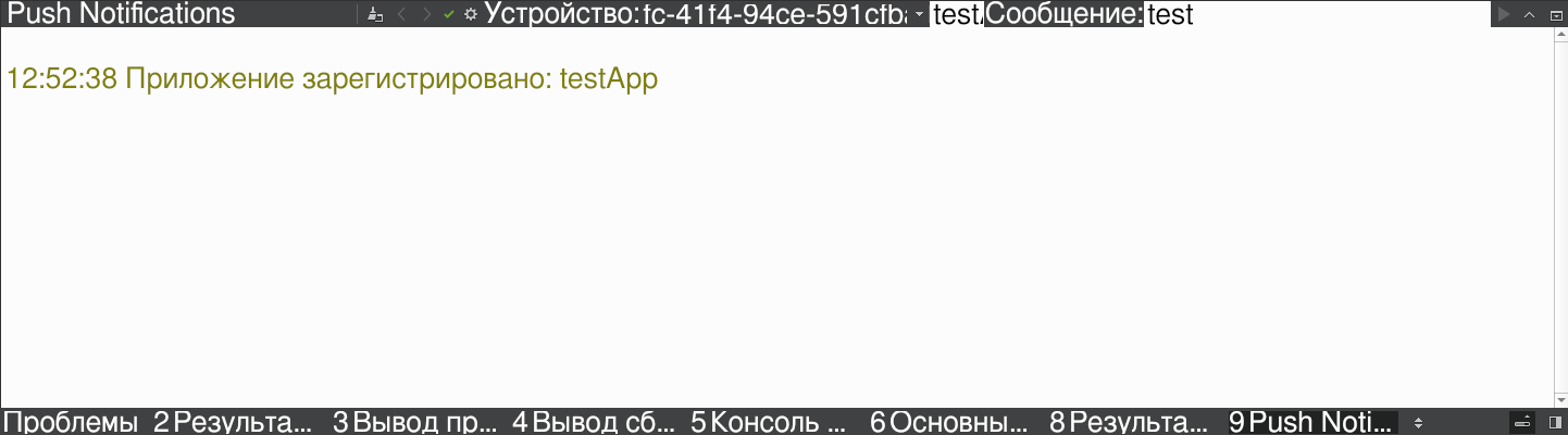 В Аврора IDE открыть нижнюю вкладку Push-уведомления или нажать сочетание клавиш «Alt + 9». На вкладке появится сообщение о регистрации приложения-клиента, содержащее его