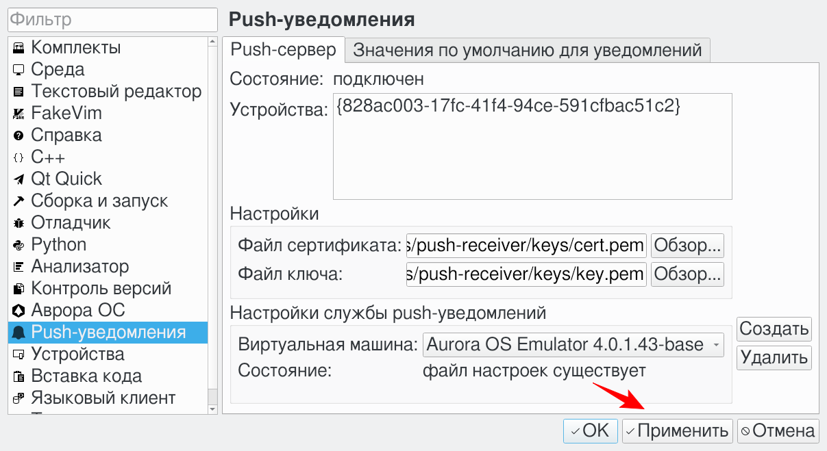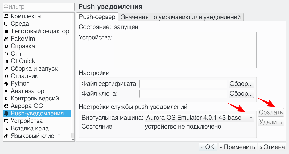 Затем нажать на кнопку Создать, чтобы создать файл настроек для службы Push-уведомлений. Кнопка Создать становится доступной после установки соединения с Push-демоном: