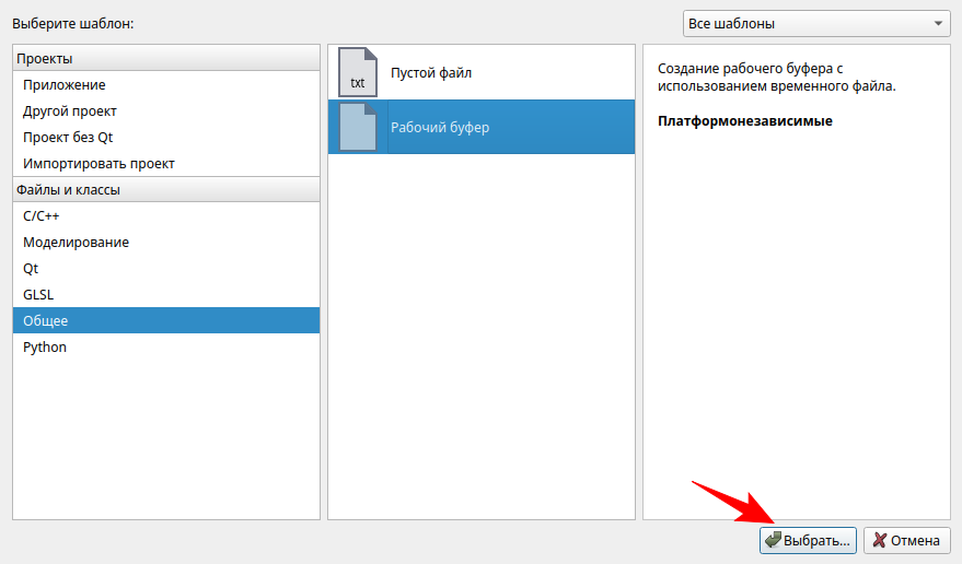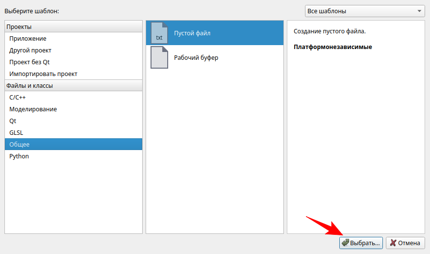 В диалоговом окне нужно выбрать «Общее» → «Пустой файл», после чего нажать кнопку «Выбрать...».