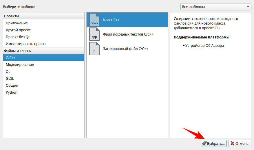 В диалоговом окне нужно выбрать «C/C++» → «Класс C++», после чего нажать кнопку «Выбрать...».
