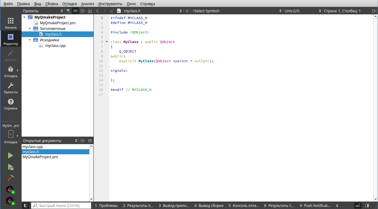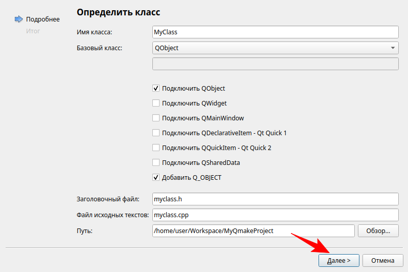На следующем шаге «Определить класс» необходимо ввести имя класса. Также можно выбрать базовый класс и опционально подключить несколько Qt-классов. Имена заголовочного и исходного файлов будут сформированы на основе имени класса, но их можно отредактировать. Путь к файлу по умолчанию берётся из активного проекта, его можно изменить. Когда настройка закончена, следует нажать кнопку «Далее».