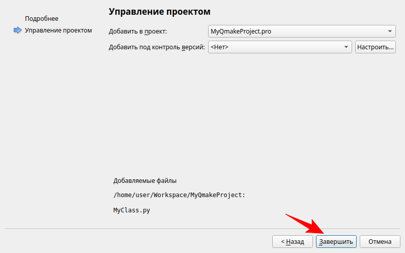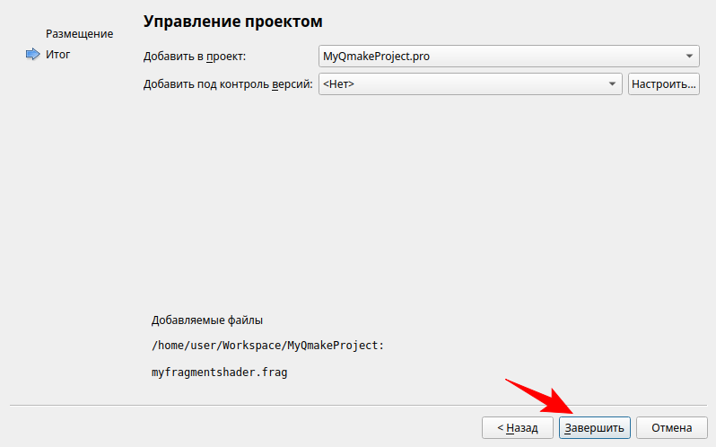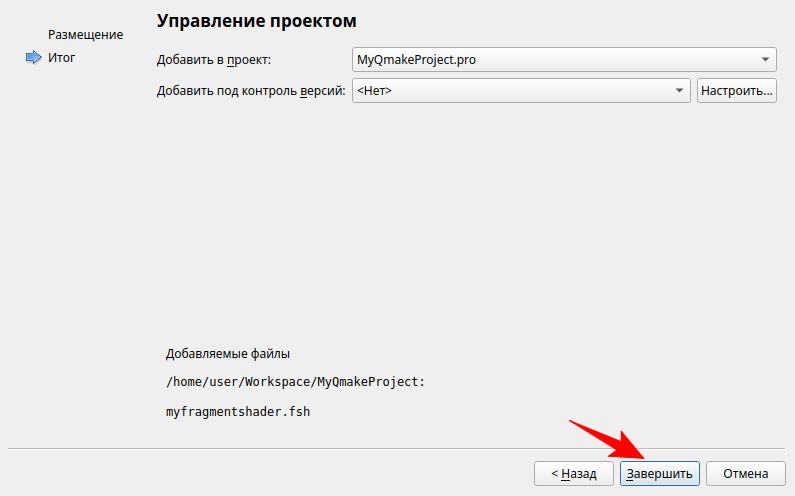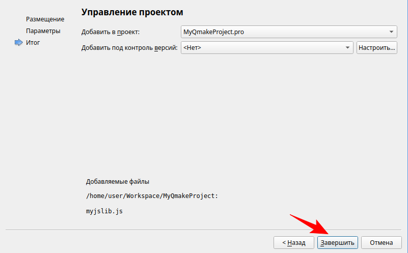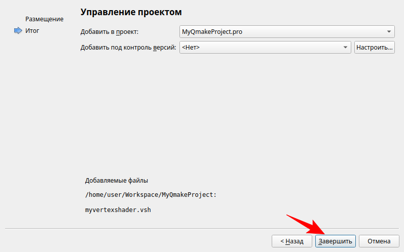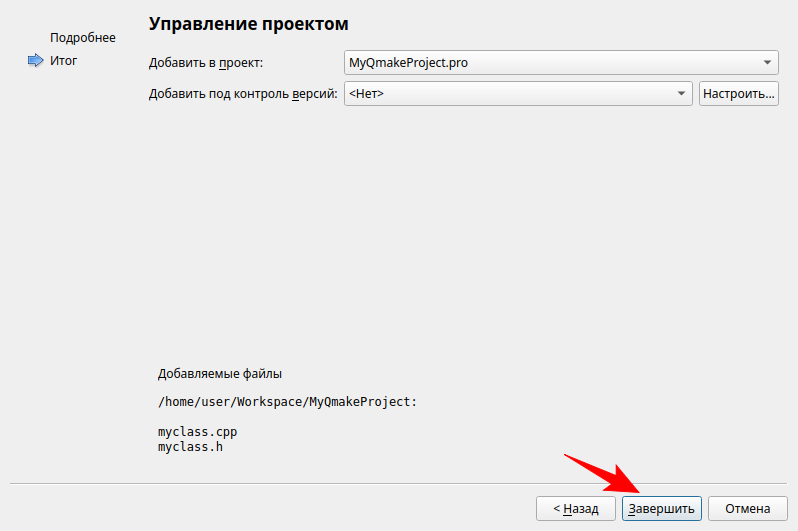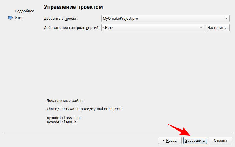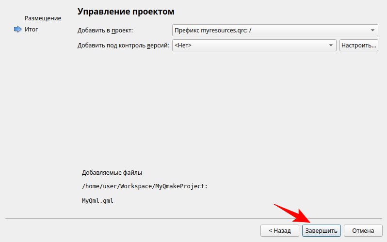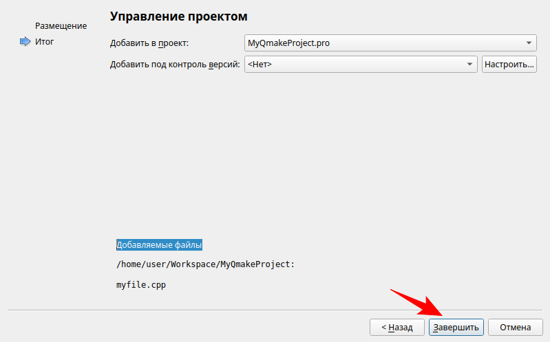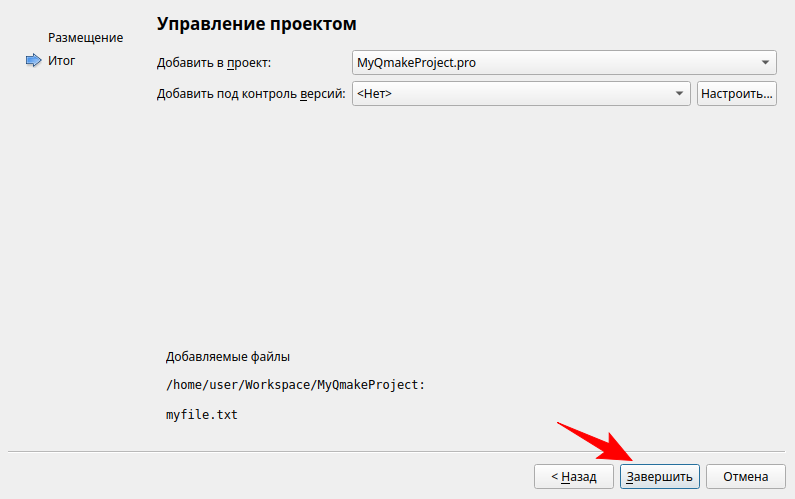 На последнем шаге Итог можно поместить файл в конкретный проект и подключить одну из систем контроля версий, доступных в операционной системе. После всех действий по начальной настройке файла следует нажать кнопку «Завершить».