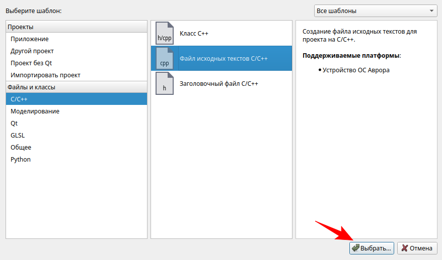 В диалоговом окне нужно выбрать «C/C++» → «Файл исходных текстов C/C++», после чего нажать кнопку «Выбрать...».