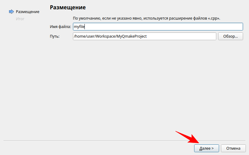 .cpp. Путь к файлу по умолчанию берётся из активного проекта, его можно изменить. Когда настройка закончена, следует нажать кнопку «Далее».