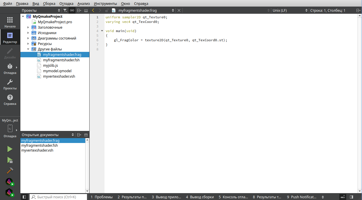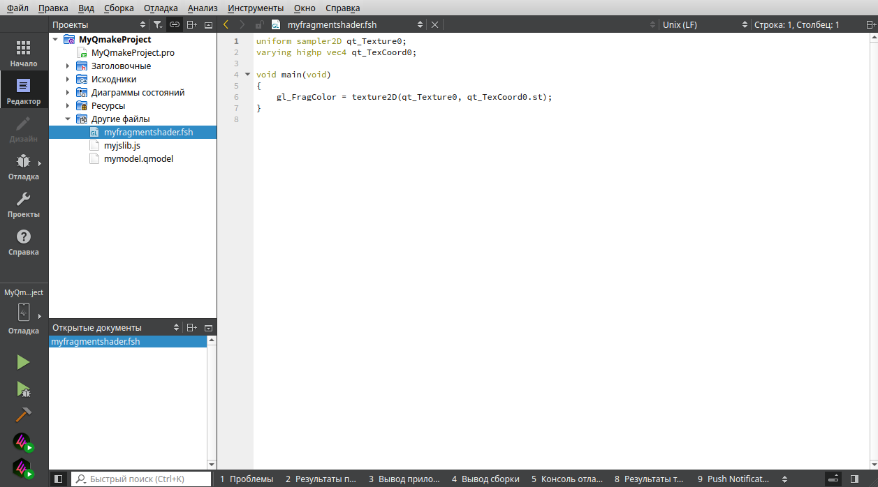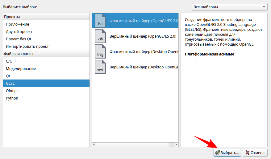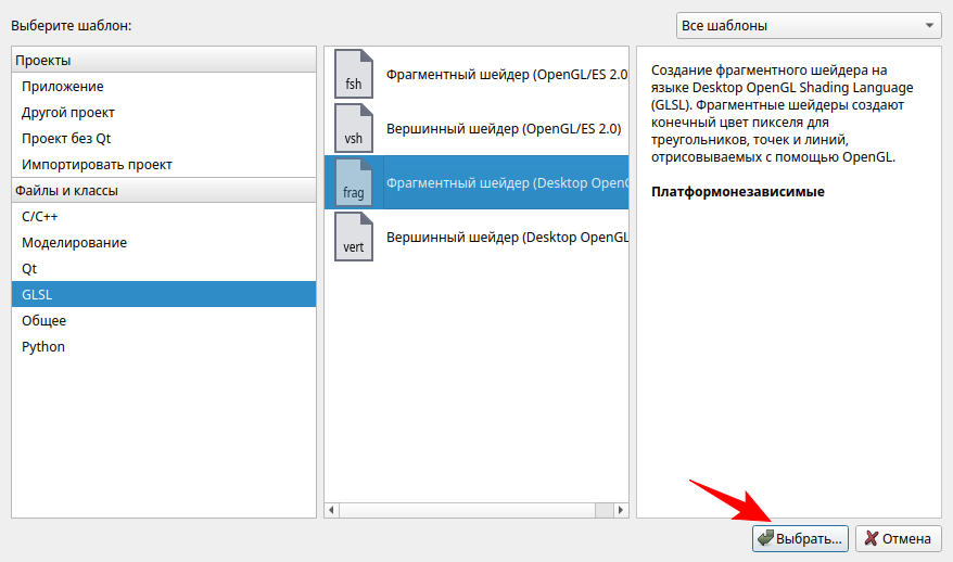 В диалоговом окне нужно выбрать «GLSL» → «Фрагментный шейдер (Desktop OpenGL)», после чего нажать кнопку «Выбрать...».