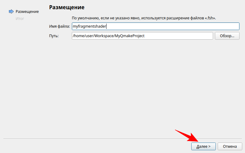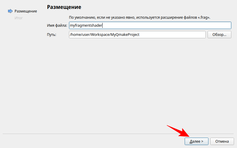 .frag. Путь к файлу по умолчанию берётся из активного проекта, его можно изменить. Когда настройка закончена, следует нажать кнопку «Далее».