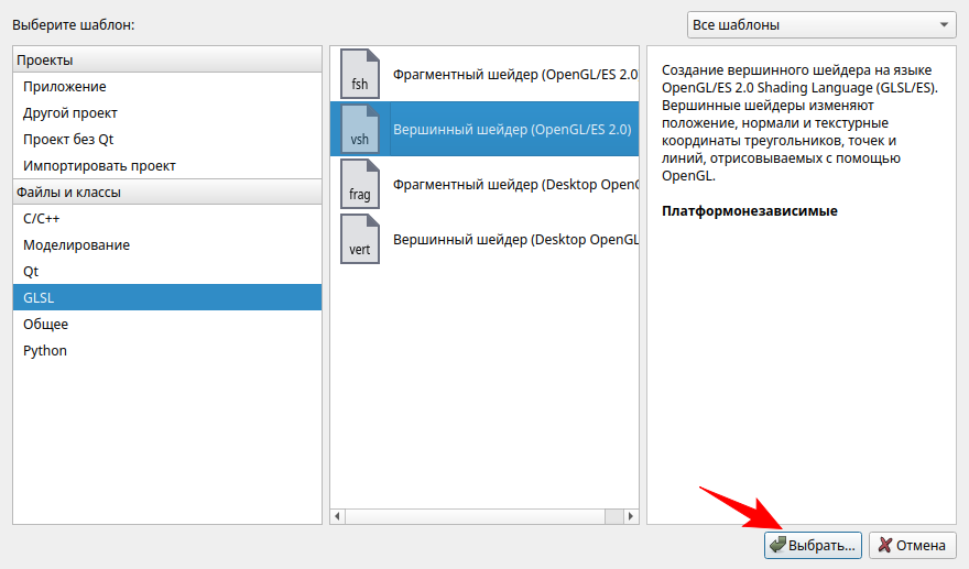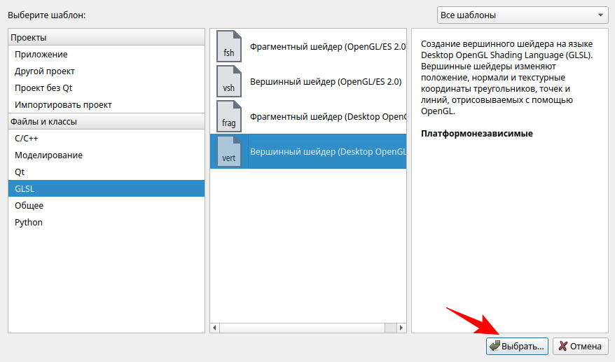 В диалоговом окне нужно выбрать «GLSL» → «Вершинный шейдер (Desktop OpenGL)», после чего нажать кнопку «Выбрать...».