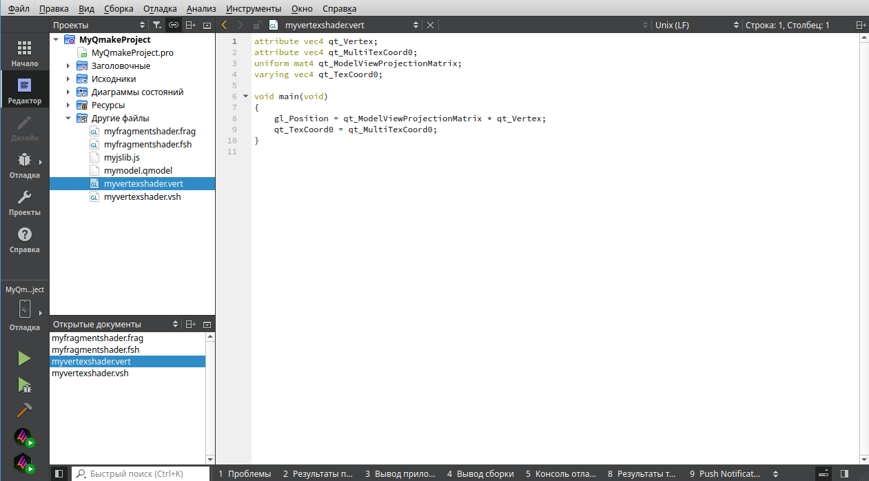 В диалоговом окне нужно выбрать «GLSL» → «Вершинный шейдер (OpenGL/ES 2.0)», после чего нажать кнопку «Выбрать...».