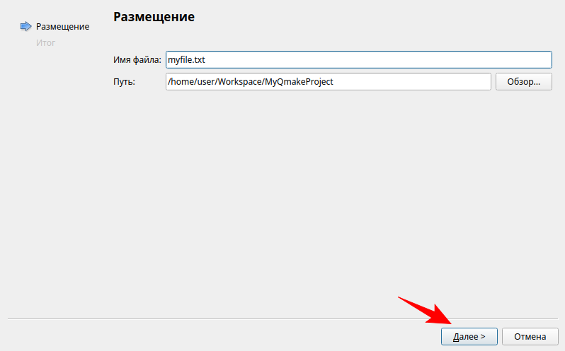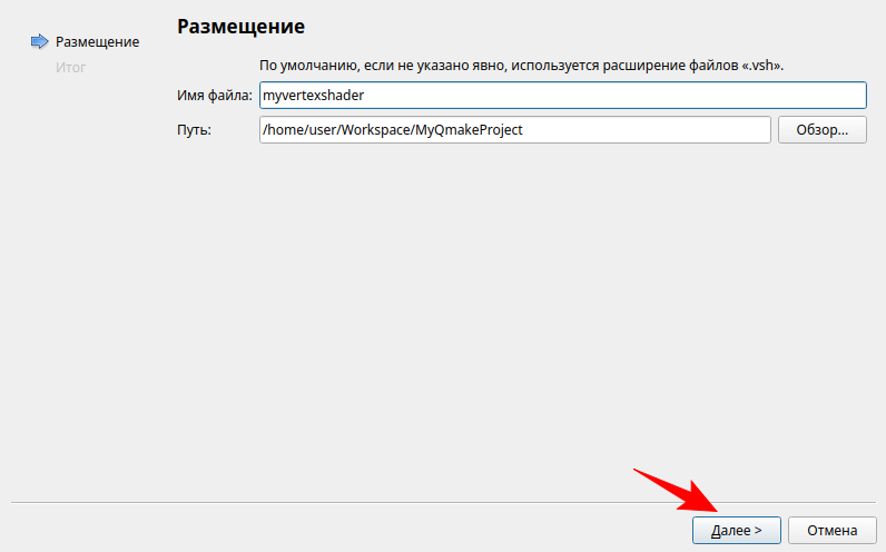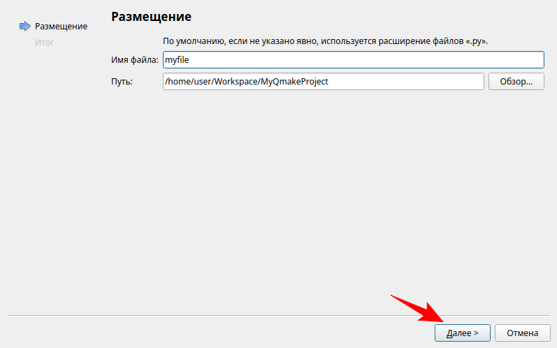 На следующем шаге «Размещение» необходимо ввести имя файла с расширением. Путь к файлу по умолчанию берётся из активного проекта, его можно изменить. Когда настройка закончена, следует нажать кнопку «Далее».