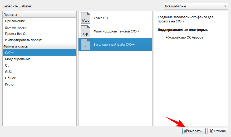 В диалоговом окне нужно выбрать «C/C++» → «Заголовочный файл C/C++», после чего нажать кнопку «Выбрать...».