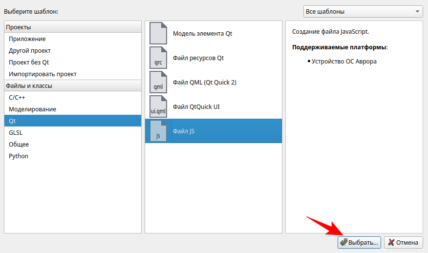 В диалоговом окне нужно выбрать «Qt» → «Файл JS», после чего нажать кнопку «Выбрать...».