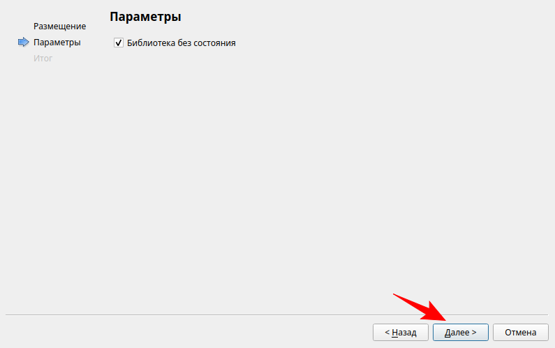На следующем шаге «Параметры» можно указать, что js-файл будет библиотекой без состояния, после чего нажать кнопку «Далее». Потом код файла можно будет отредактировать и убрать или добавить этот параметр.