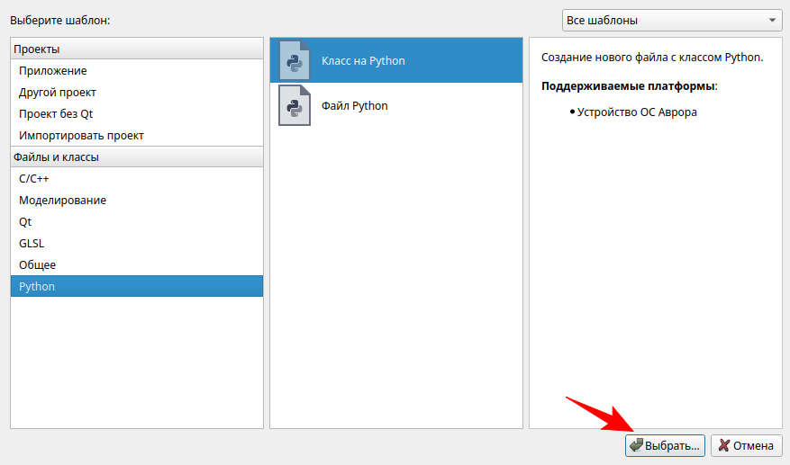 В диалоговом окне нужно выбрать «Python» → «Класс на Python», после чего нажать кнопку «Выбрать...».