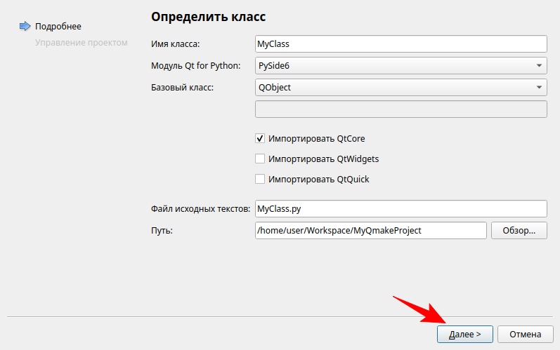 На следующем шаге «Определить класс» необходимо ввести имя класса. Также можно выбрать модуль Qt for Python, базовый класс и опционально импортировать несколько Qt-модулей. Имя файла будет сформировано на основе имени класса, но его можно отредактировать. Путь к файлу по умолчанию берётся из активного проекта, его можно изменить. Когда настройка закончена, следует нажать кнопку «Далее».