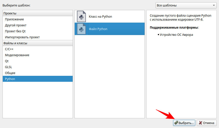 В диалоговом окне нужно выбрать «Python» → «Файл Python», после чего нажать кнопку «Выбрать...».
