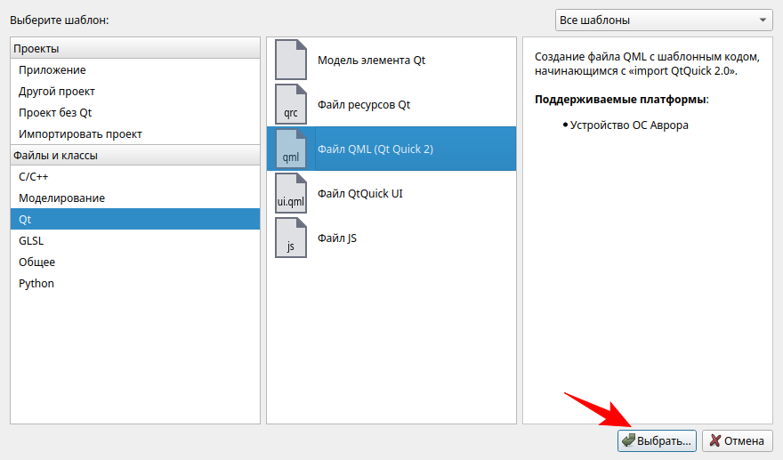 В диалоговом окне нужно выбрать «Qt» → «Файл QML (Qt Quick 2)», после чего нажать кнопку «Выбрать...».