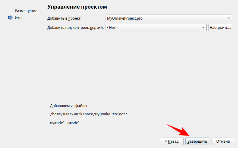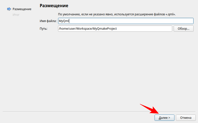 .qml. Путь к файлу по умолчанию берётся из активного проекта, его можно изменить. Когда настройка закончена, следует нажать кнопку «Далее».