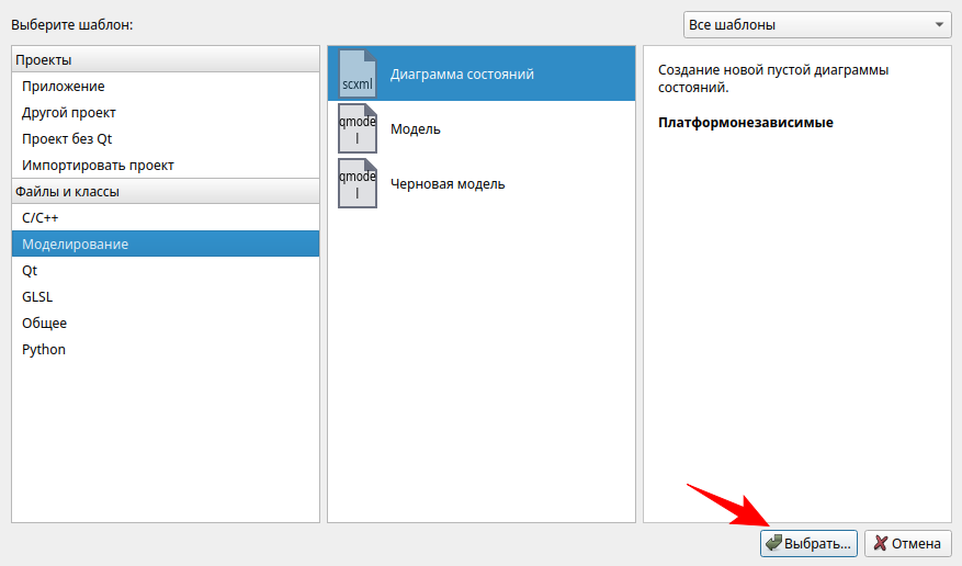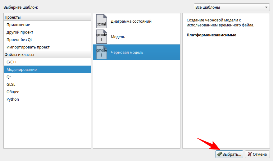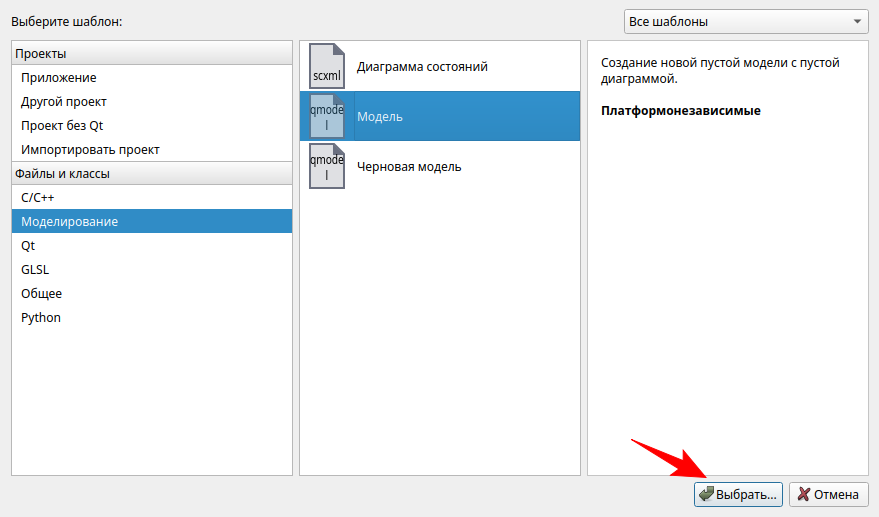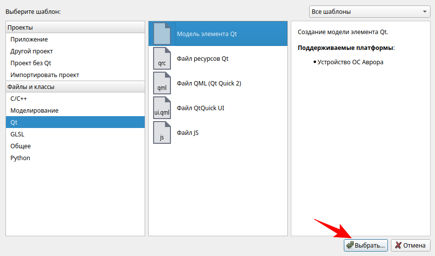 В диалоговом окне нужно выбрать «Qt» → «Модель элемента Qt», после чего нажать кнопку «Выбрать...».