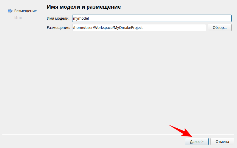 На следующем шаге «Размещение» необходимо ввести имя модели. Путь к файлу по умолчанию берётся из активного проекта, его можно изменить. Когда настройка закончена, следует нажать кнопку «Далее».