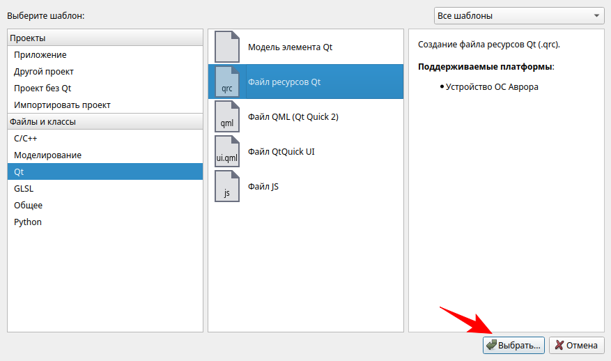 В диалоговом окне нужно выбрать «Qt» → «Файл ресурсов Qt», после чего нажать кнопку «Выбрать...».