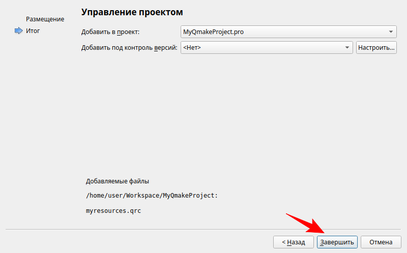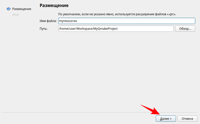 .qrc. Путь к файлу по умолчанию берётся из активного проекта, его можно изменить. Когда настройка закончена, следует нажать кнопку «Далее».