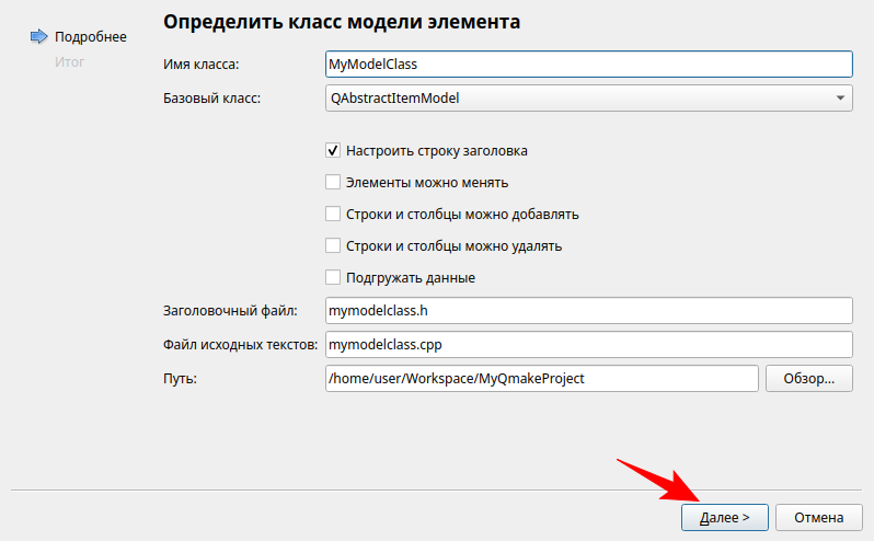 На следующем шаге «Определить класс модели элемента» необходимо ввести имя класса модели. Также можно выбрать базовый класс и опционально включить настройку строки заголовка, изменение элементов, добавление и удаление строк и столбцов, подгрузку данных. Имена заголовочного и исходного файлов будут сформированы на основе имени класса, но их можно отредактировать. Путь к файлу по умолчанию берётся из активного проекта, его можно изменить. Когда настройка закончена, следует нажать кнопку «Далее».