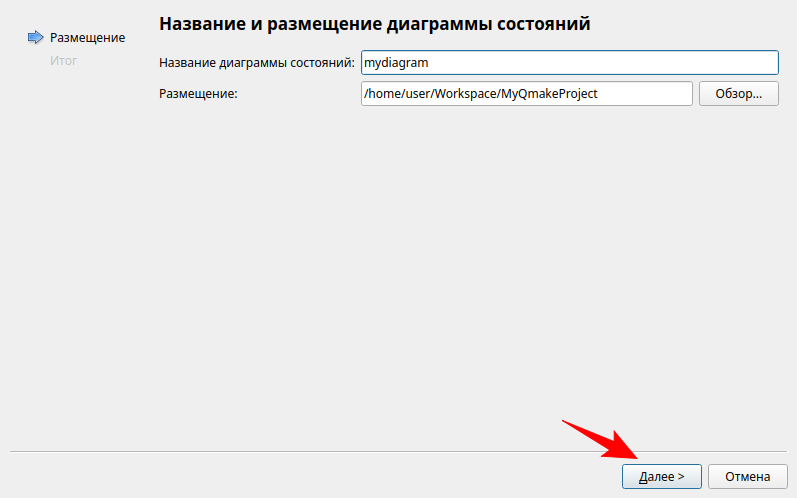 На следующем шаге «Размещение» необходимо ввести имя диаграммы. Путь к файлу по умолчанию берётся из активного проекта, его можно изменить. Когда настройка закончена, следует нажать кнопку «Далее».