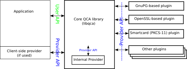 Руководствуясь похожей по названию Криптографической архитектурой Java, QCA стремится предоставить простой и кроссплатформенный криптографический API, использующий типы данных и соглашения Qt. QCA отделяет API от реализации, используя плагины, называемые криптопровайдерами. Преимущество этой модели состоит в том, чтобы позволить приложениям избегать сопряжения или явной зависимости от какой-либо конкретной криптографической библиотеки. Эта функциональность позволяет легко изменять или обновлять реализации криптопровайдера без необходимости перекомпилировать приложение!