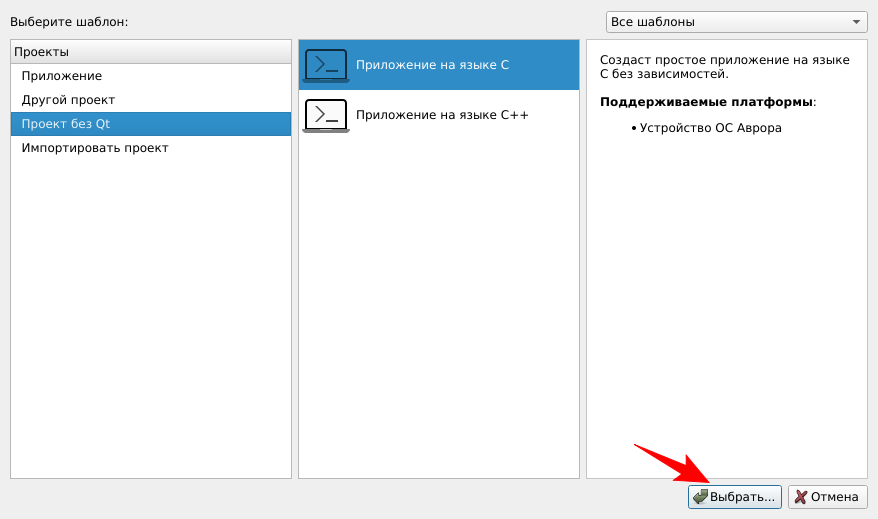 В диалоговом окне нужно выбрать Проект без Qt → Приложение на языке C, после чего нажать кнопку Выбрать....