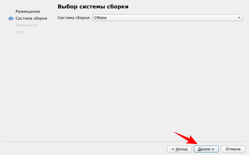 На следующем шаге Выбор системы сборки нужно указать систему сборки проекта: qmake или Cmake, и нажать кнопку Далее.