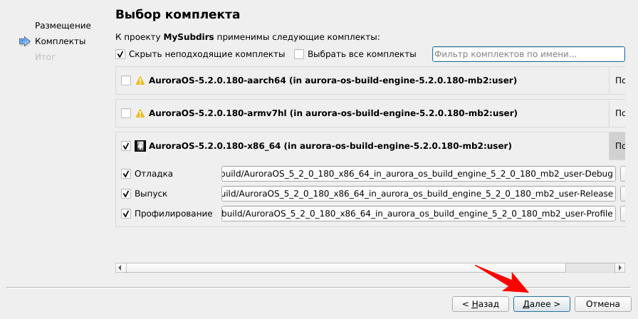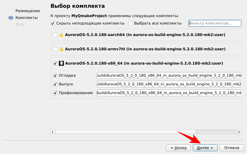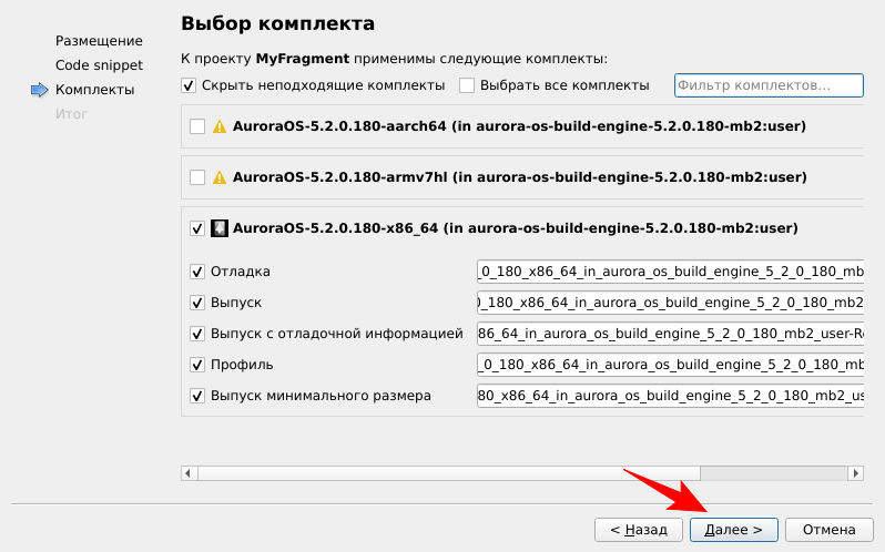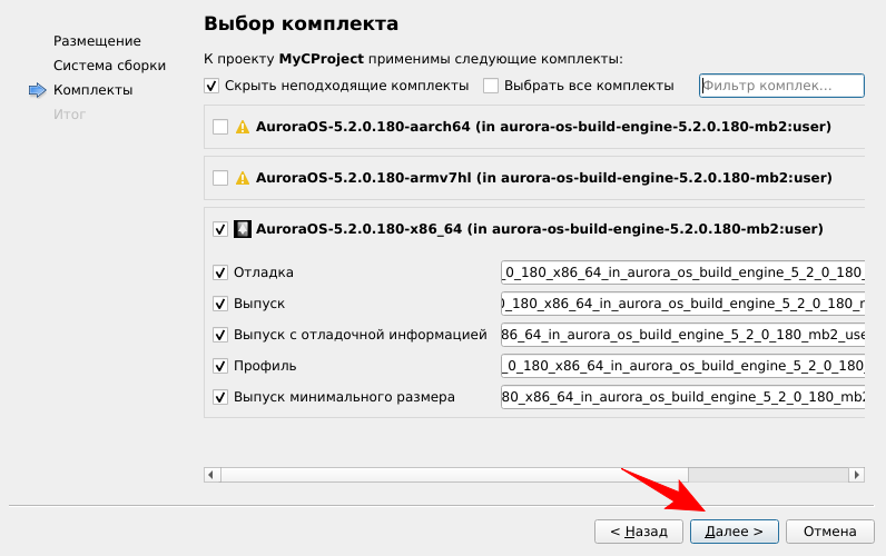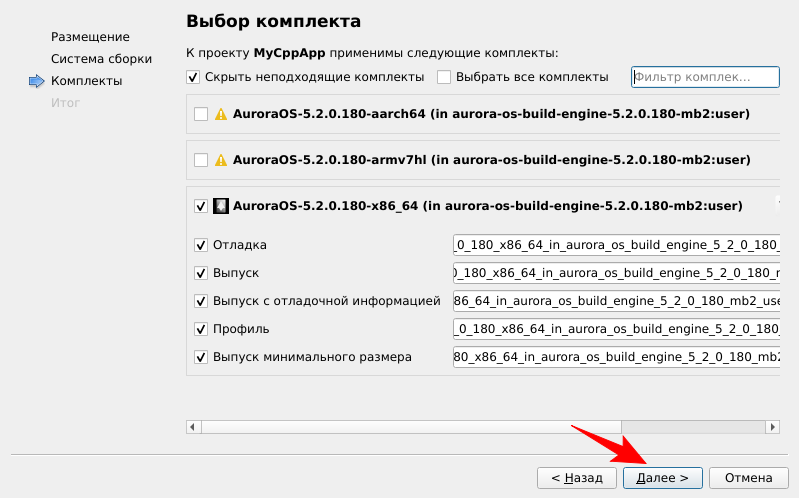 На следующем шаге Выбор комплекта выбрать необходимые комплекты для сборки и нажать кнопку Далее. Комплекты armv7hl и aarch64 используются для мобильных устройств, x86_64 — для эмулятора. Позже набор комплектов можно изменить в настройках проекта.