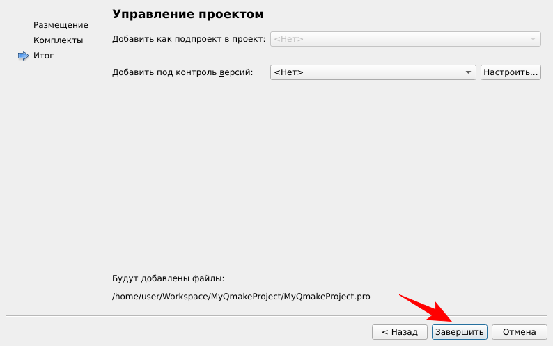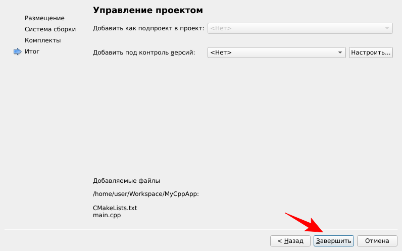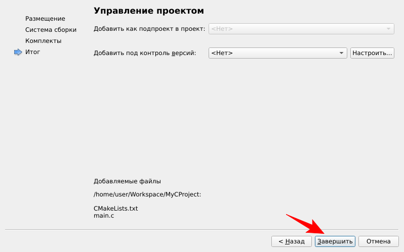 На последнем шаге Итог можно настроить взаимное положение проекта относительно других и подключить одну из систем контроля версий, доступных в операционной системе. После всех действий по начальной настройке проекта следует нажать кнопку Завершить.