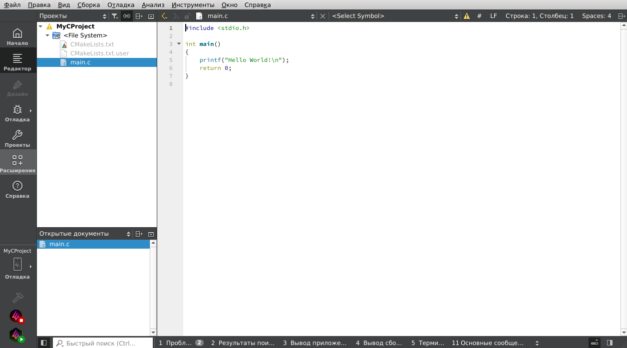 В IDE можно создать простое приложение на языке C без зависимостей.