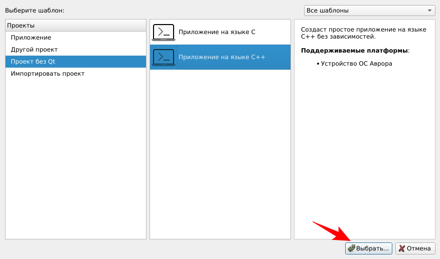 В диалоговом окне нужно выбрать Проект без Qt → Приложение на языке C++, после чего нажать кнопку Выбрать....