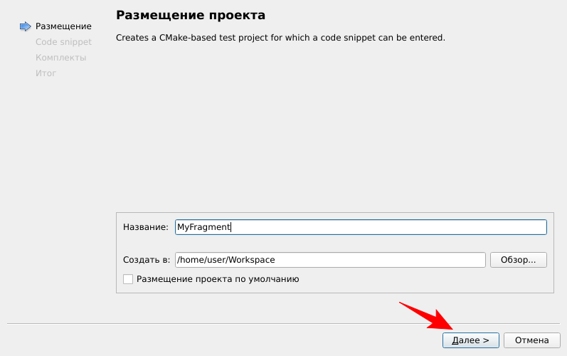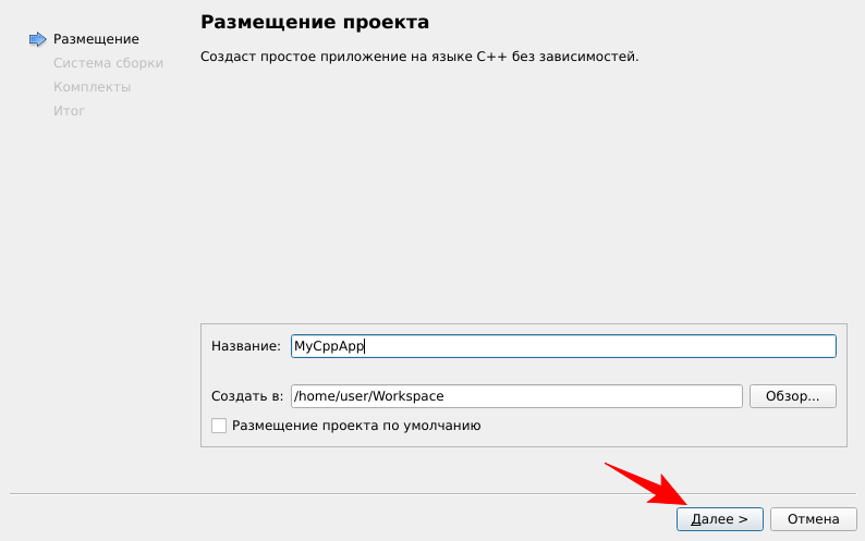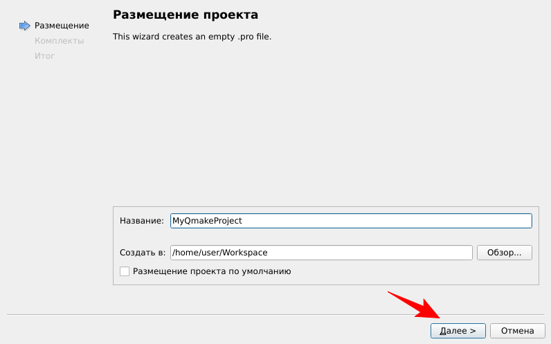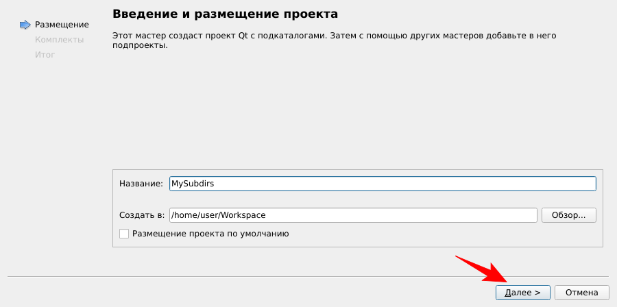 В появившемся окне Размещение проекта в левой части окна перечислены шаги, которые следует пройти для указания параметров проекта. В правой части окна следует указать название проекта, директорию и нажать кнопку Далее. Важно иметь в виду, что проект должен находиться или в домашней директории пользователя, или в альтернативной директории, указанной при установке Аврора SDK. Если отметить пункт Размещение проекта по умолчанию, то указанная директория будет использоваться для следующих создаваемых проектов.
