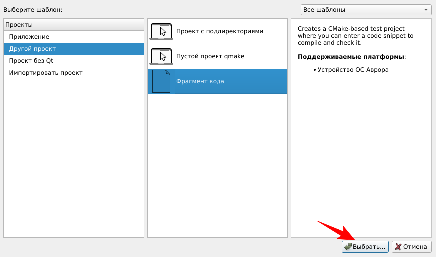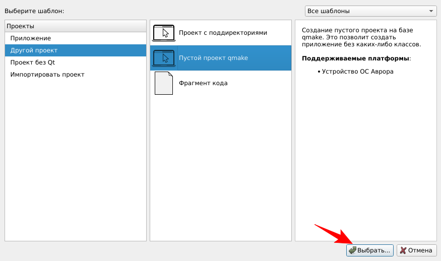 В диалоговом окне нужно выбрать Другой проект → Пустой проект qmake, после чего нажать кнопку Выбрать....