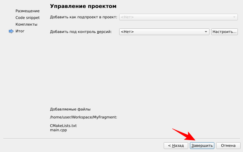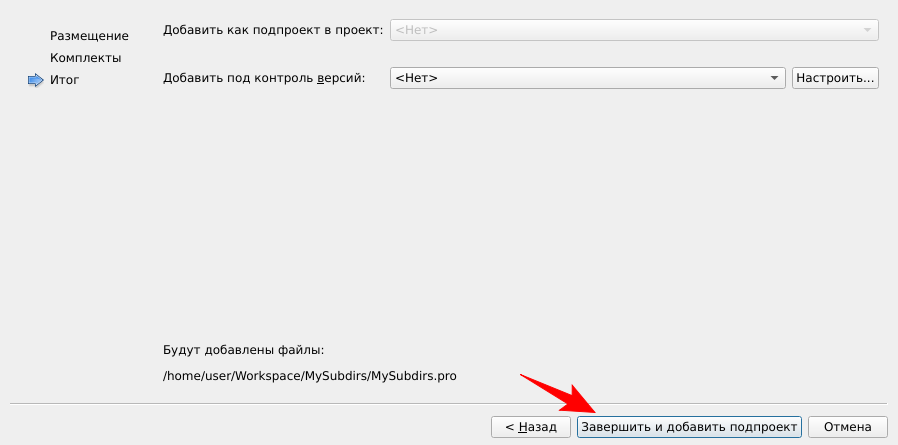 На последнем шаге Итог можно настроить взаимное положение проекта относительно других и подключить одну из систем контроля версий, доступных в операционной системе. После всех действий по начальной настройке проекта следует нажать кнопку Завершить и добавить подпроект.