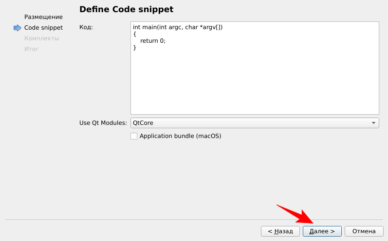 На следующем шаге Define Code snippet можно отредактировать фрагмент кода, сгенерированный по умолчанию. Также можно указать необходимые Qt-модули или выбрать Application bundle (для mac). Затем нажать кнопку Далее.