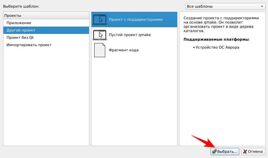 В мастере создания подпроектов можно выбрать нужный тип подпроекта: приложение для ОС Аврора, проект автотестирования, проект с поддиректориями и т. д. При создании подпроекта можно обратиться к другим частям данного руководства.