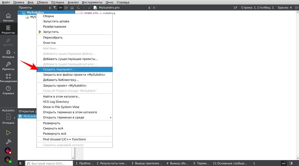 Также можно создать подпроект, выбрав пункт Создать подпроект в контекстном меню проекта.